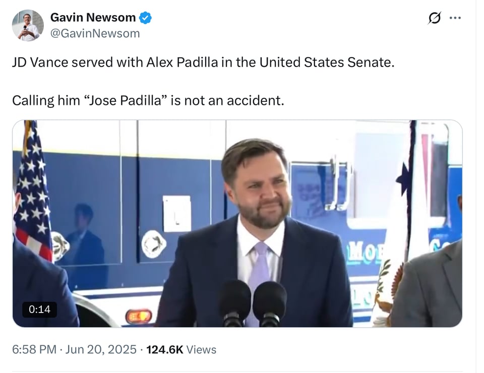 Once again seeding the idea that a Democratic lawmaker must be a criminal, Vance called the California senator “José Padilla,” using the name of a man convicted in 2007 of conspiring to commit murder and fund terrorism.