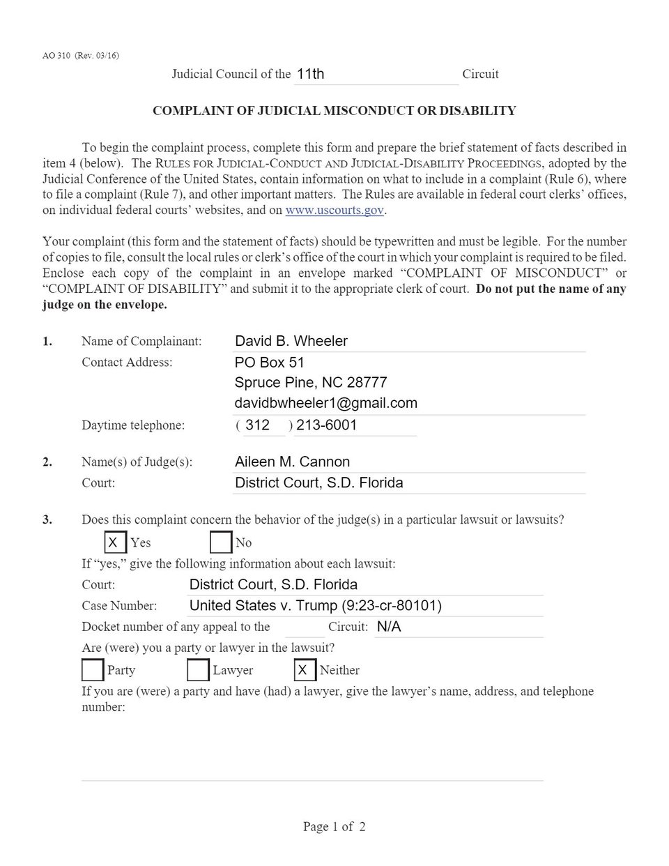 Here is David Wheeler’s full complaint against Judge Cannon.