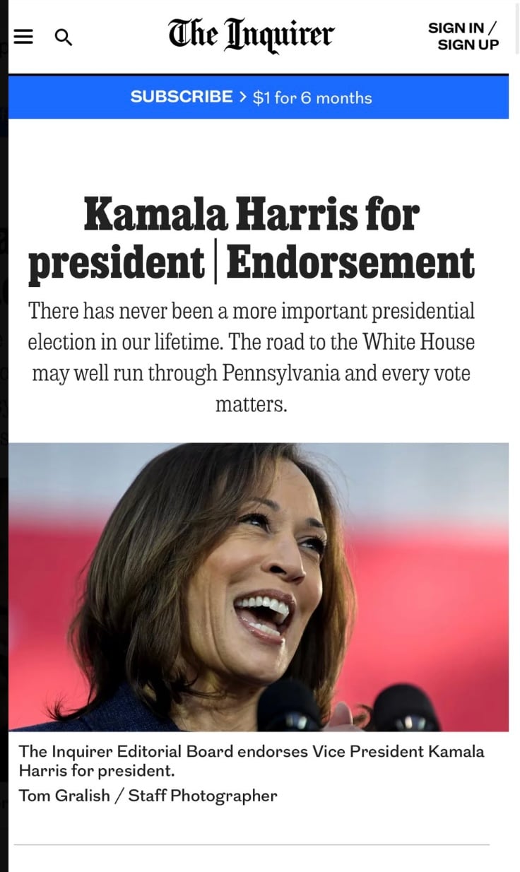🚨 Philadelphia Inquirer in battleground Pennsylvania endorses Vice President Harris