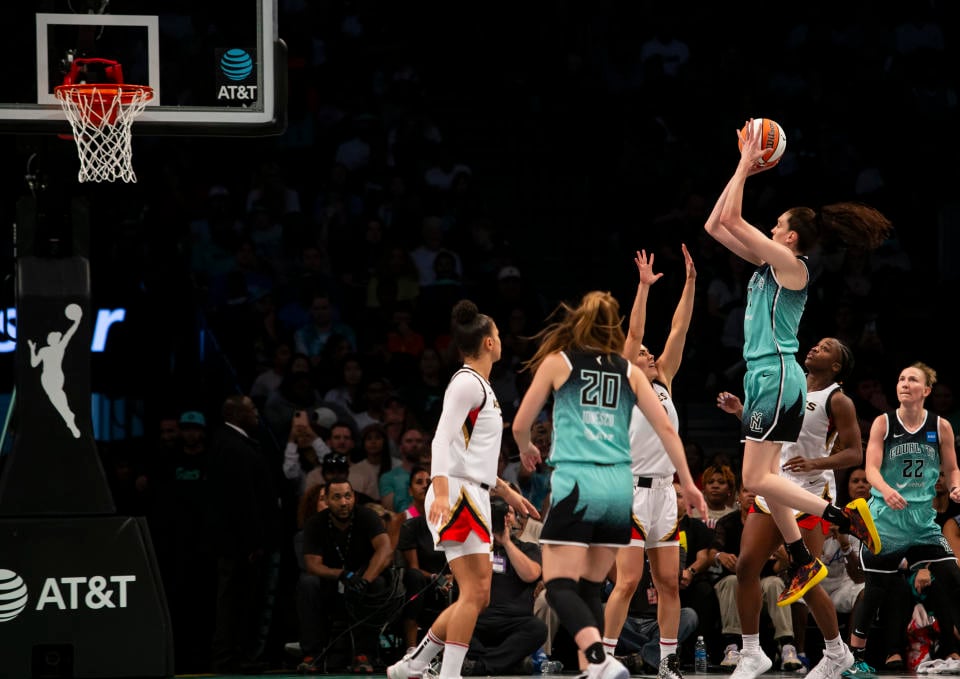 The New York Liberty and Las Vegas Aces will meet in the 2023 WNBA Finals this weekend. Liberty star Breanna Stewart, WNBA 2023 MVP, is the player in the air.