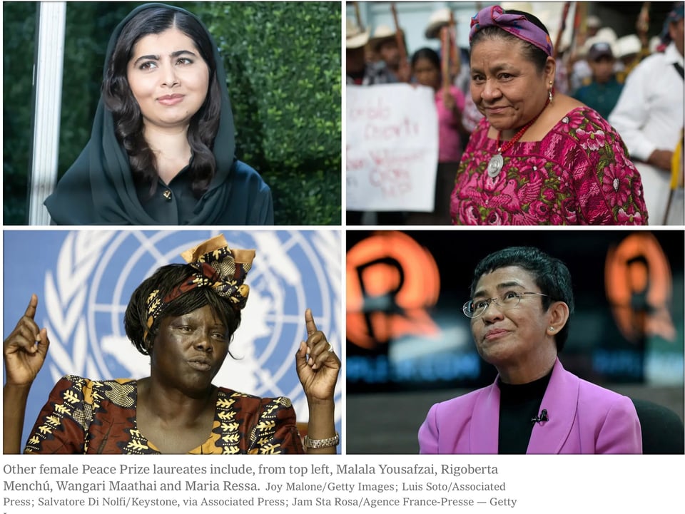 Other women to receive the honor include the Philippine journalist Maria Ressa, who was named in 2021; Mother Teresa in 1979; the legal reformer Shirin Ebadi of Iran in 2003; the Kenyan environmentalist Wangari Maathai in 2004; and, in 2014, the education activist Malala Yousafzai, the youngest recipient of the award.