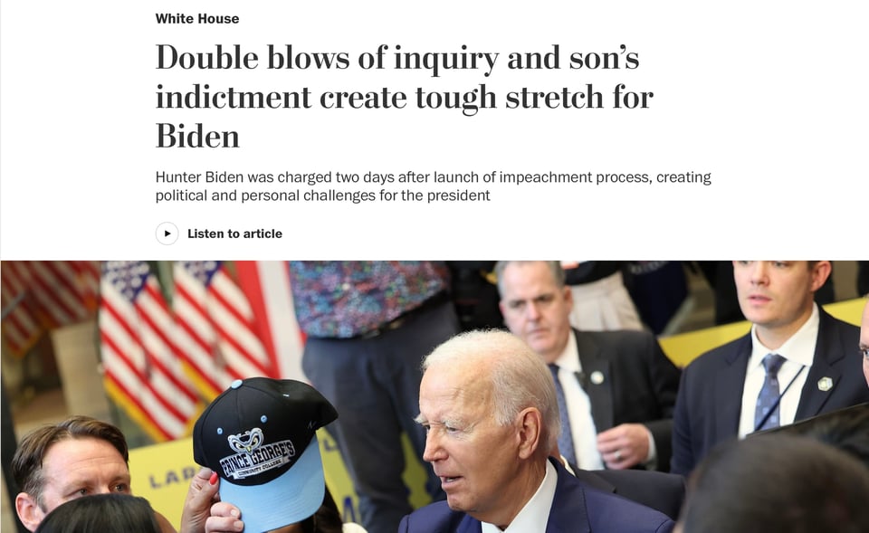 “Double blows of inquiry and son’s indictment create tough stretch for Biden.”