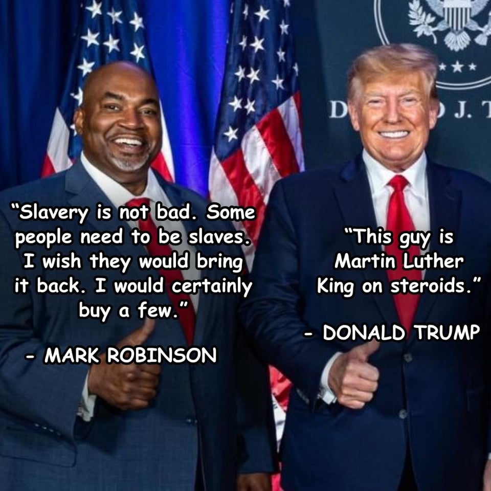 From Historian Heather Cox Richardson - And yet the big story today is that Republican North Carolina lieutenant governor Mark Robinson frequented porn sites, where between 2008 and 2012 he wrote that he enjoyed watching transgender pornography; referred to himself as a “black NAZI!”; called for reinstating human enslavement and wrote, “I would certainly buy a few”; called the Reverend Dr. Martin Luther King Jr. a “f*cking commie bastard”; wrote that he preferred Adolf Hitler to former president Barack Obama; referred to Black, Jewish, Muslim, and gay people with slurs; said he doesn’t care about abortions (“I don’t care. I just wanna see the sex tape!” he wrote); and recounted that he had secretly watched women in the showers in a public gym as a 14-year-old.