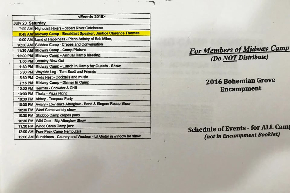 Charles and David Koch’s access to Thomas has gone well beyond his participation in their donor events. For years, the brothers had opportunities to meet privately with Thomas thanks to the justice’s regular trips to the Bohemian Grove, an all-male retreat that attracts some of the nation’s most influential corporate and political figures. Thomas has been a regular at the Grove for 25 years as Harlan Crow’s guest, according to internal documents and interviews with dozens of members, other guests and workers at the retreat.