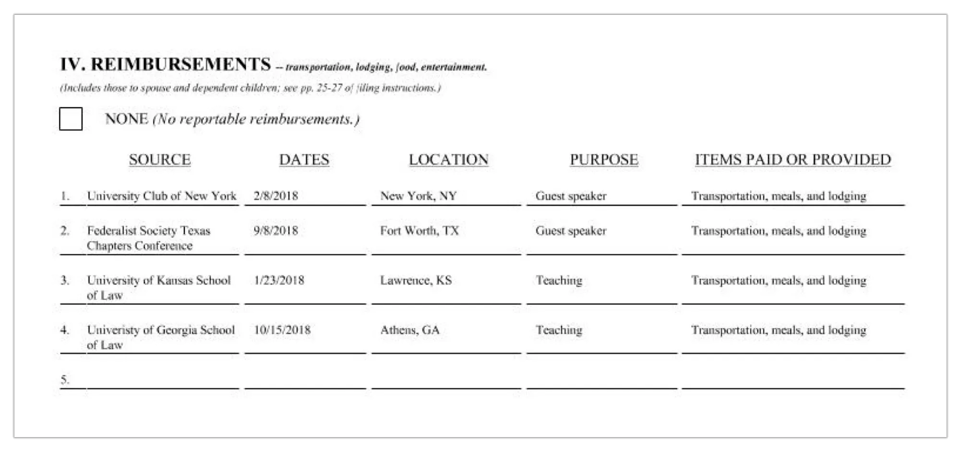 Thomas’ financial disclosure for that year contains two speaking engagements: one in New York City and another at a Federalist Society conference in Texas. His trip to the Koch event in California is not on the form.