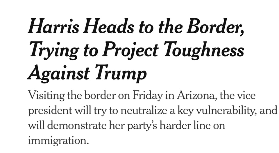 But even the Times had admits this - “On Friday, in the border community of Douglas, Ariz., Ms. Harris is expected to give a speech accusing Mr. Trump of playing politics with immigration and reaffirming her commitment to signing the border legislation. She is also likely to note that crossings have dropped significantly since President Biden signed an executive order in June that prevented migrants from seeking asylum at the border when crossings surge.”