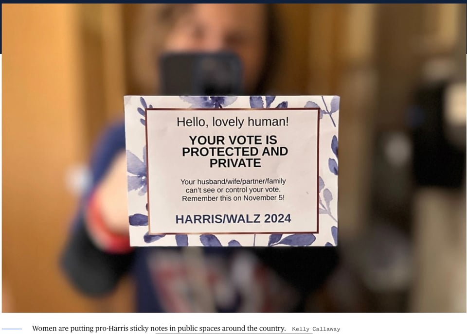 In the weeks before Election Day, a loose-knit group of women are organizing online to blanket their communities with pro-Kamala Harris messages — not on yard signs or fliers, but on sticky notes.