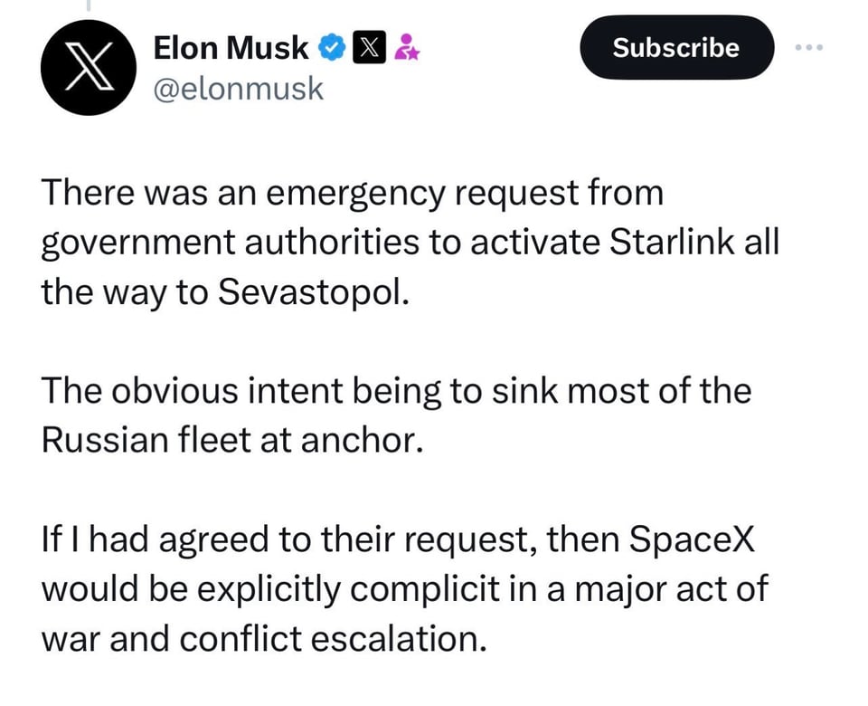 We recently learned what Elon Musk did to support Putin, using Starlink which he owns.