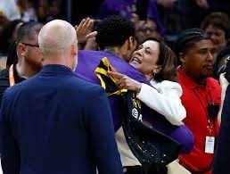 Nneka Ogwumike, the Los Angeles star and WNBA players' union executive committee president, presented Harris with a Sparks jersey and thanked her.
