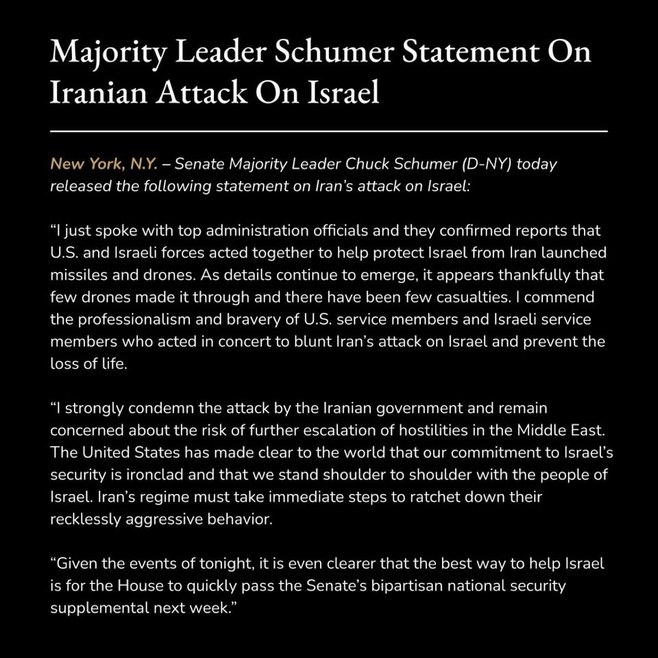 In the face of Iran’s strikes on Israel, the United States must stand with our ally as it defends its people and its sovereignty. President Biden says America’s commitment to Israel is “ironclad”. It’s time to match words with action.