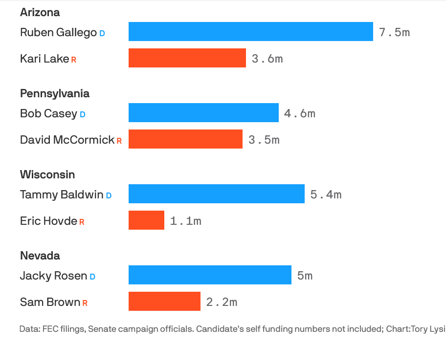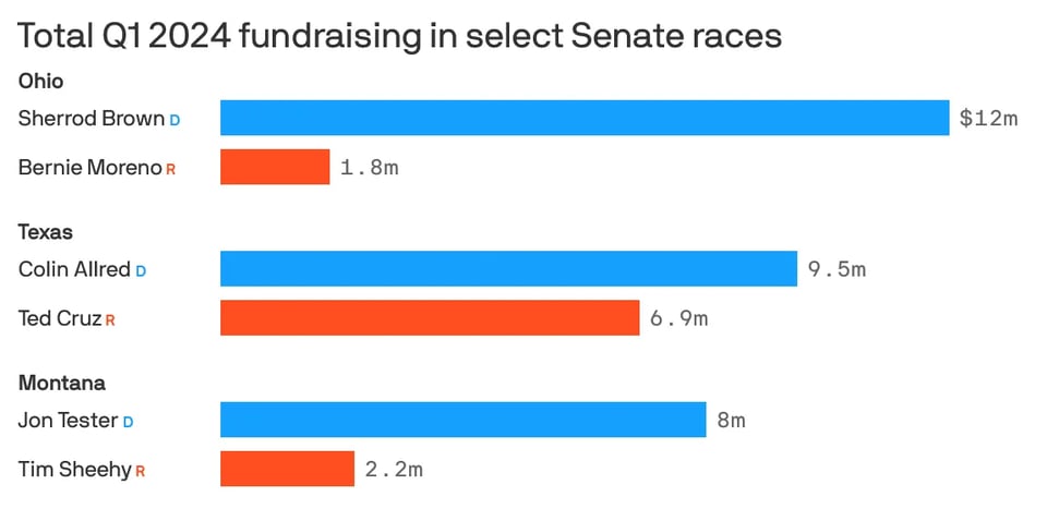 We are also starting to get 1st quarter fundraising reports in for Senate and House candidates, and once again we are seeing that same basic dynamic since Dobbs I talk so much about - heightened Democratic performance, Republican struggle. Here’s Axios this morning, “Democratic Senate candidate rout GOP in fundraising,” and here’s the charts they shared: