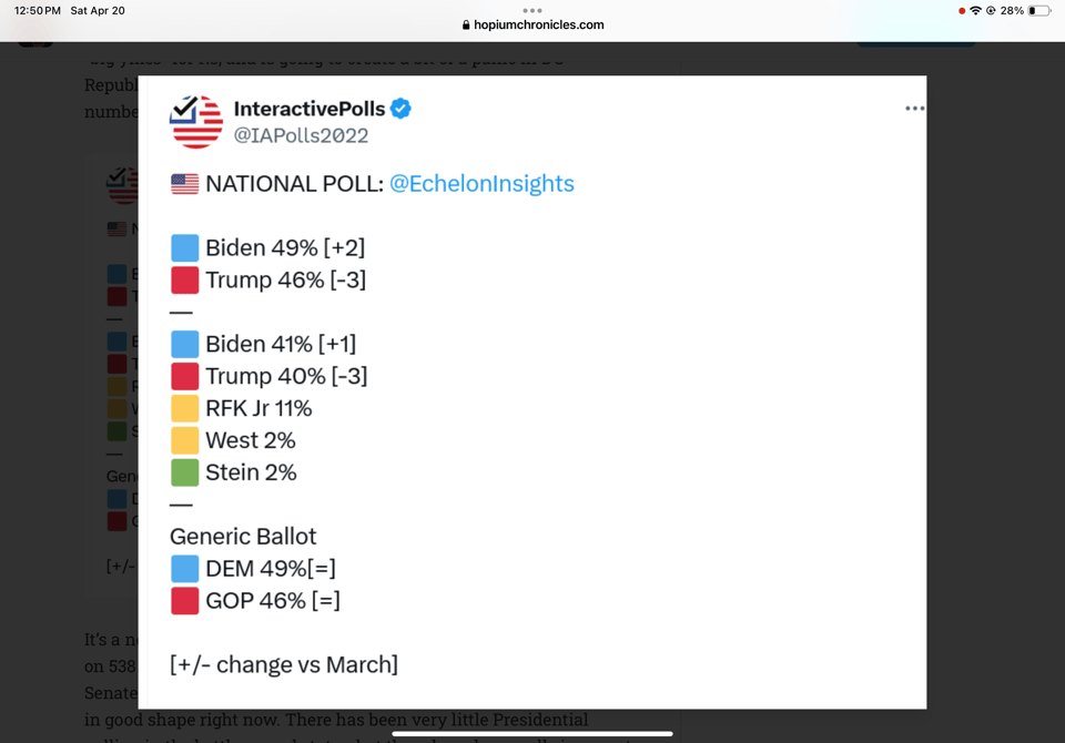 Yesterday, Echelon, a respected Republican pollster, released a poll showing Biden up 3, 49-46, and the Congressional Generic was also +3 Dem. Trump led in this poll by 4 points in February. This poll is a “big yikes” for Rs, and is going to create a bit of a panic in DC Republican circles, as are some of the early first quarter fundraising numbers we get into below.
