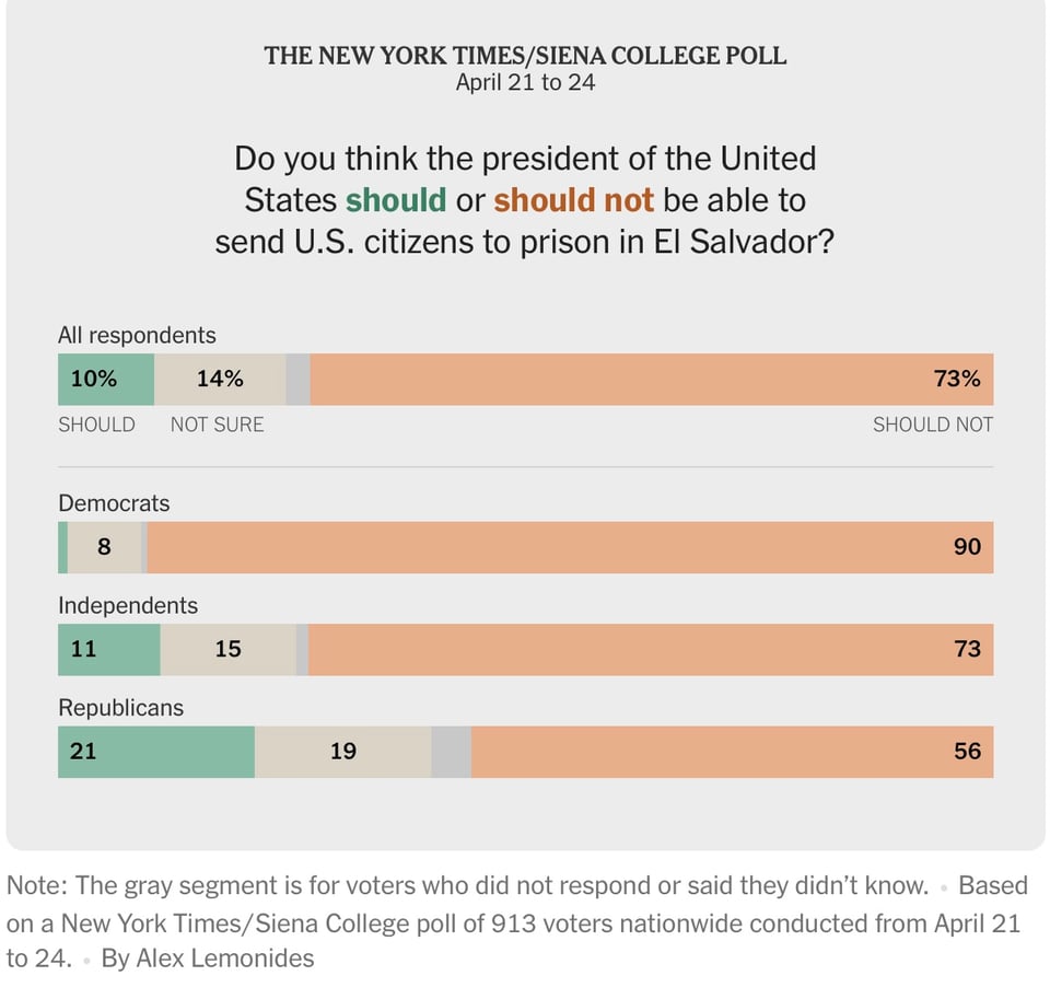 73 percent of voters, including 56 percent of Republicans, said a president should not be able to send American citizens to prison in El Salvador, as Mr. Trump has threatened to do.