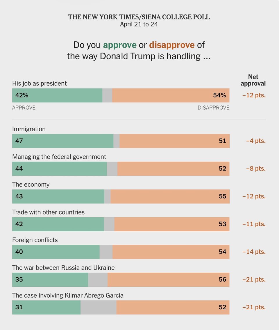 About half of voters — and about 60 percent of independents — said they disapproved of Mr. Trump’s handling of trade with other countries; the federal work force; the war between Russia and Ukraine; and the case of Kilmar Armando Abrego Garcia, a migrant in Maryland who was mistakenly deported to a prison in El Salvador as part of Mr. Trump’s immigration crackdown.