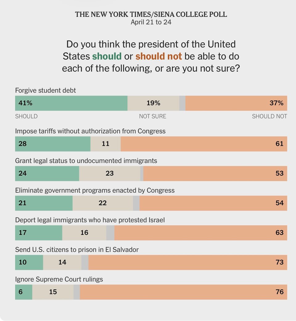 And as Mr. Trump’s administration has veered toward open defiance of court orders, a sky-high 76 percent of voters, and 61 percent of Republicans, said a president should not be able to ignore the Supreme Court.