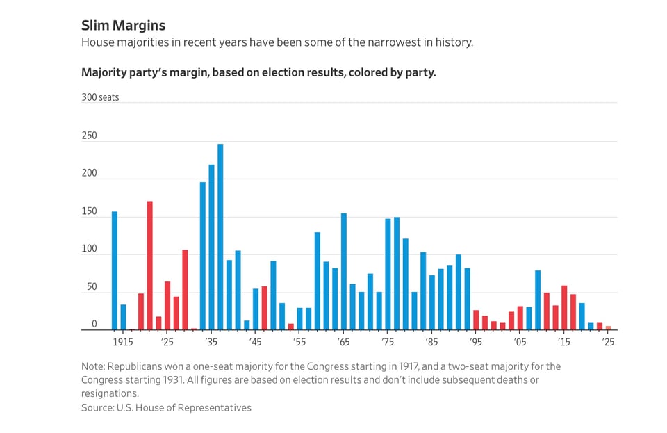 The experience of the past two years shows how volatile thin majorities can be. After starting 2023 with a 10-seat margin in the House, Republicans saw their majority temporarily whittled away to a four-seat margin this past spring before expanding again when seats were filled. Republicans ended up with an eight-seat advantage, at 219-211.