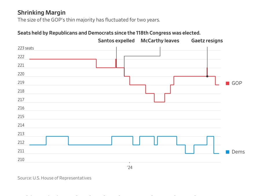 Republicans won 220 seats to Democrats’ 215. One planned vacancy—that of former Rep. Matt Gaetz, who was elected to another term but said he won’t take office—will reduce Republicans to 219 when lawmakers reconvene on Jan. 3. Two resignations of lawmakers set to join the Trump administration—Reps. Elise Stefanik and Mike Waltz—will temporarily reduce GOP numbers to 217 later in January before special elections are held. President-elect Donald Trump starts his second term on Jan. 20.