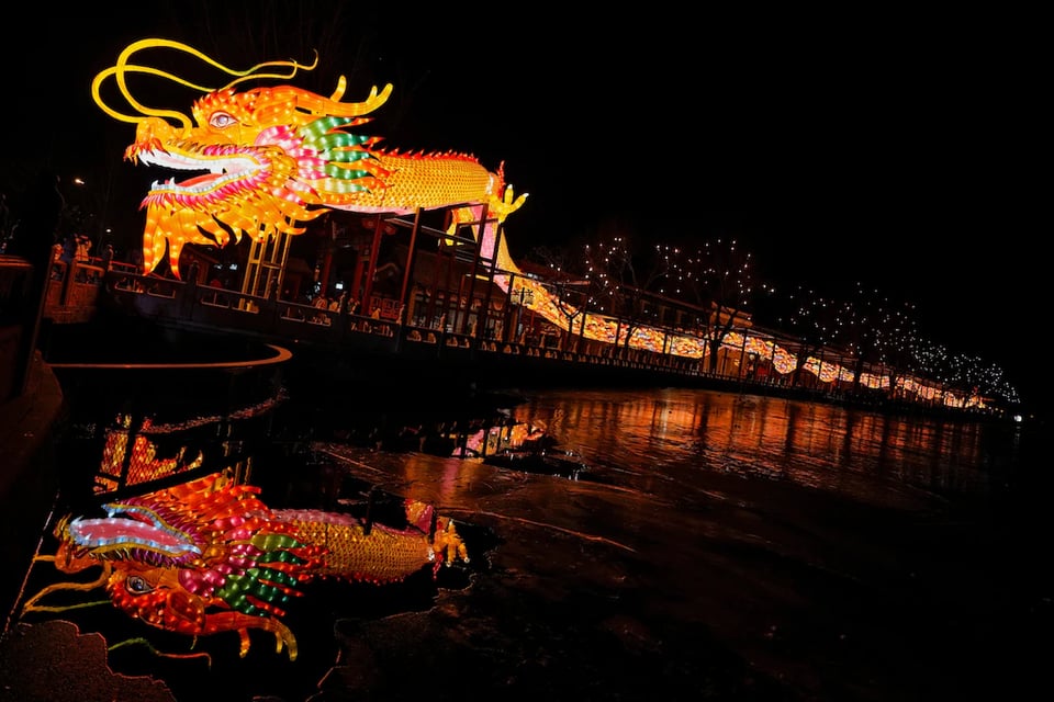 Visitors tour underneath a giant dragon lantern reflected on the frozen Houhai Lake in Beijing, Feb. 8, 2024.