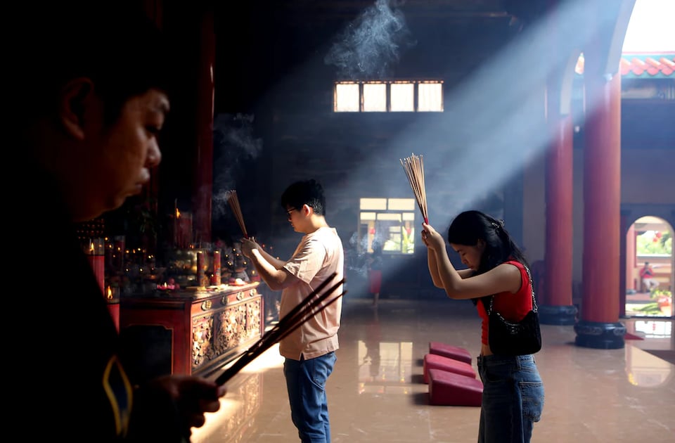 Worshipers hold incense sticks as they pray during a Lunar New Year celebration at Satya Dharma temple in Denpasar on the island of Bali, Indonesia, on Saturday.