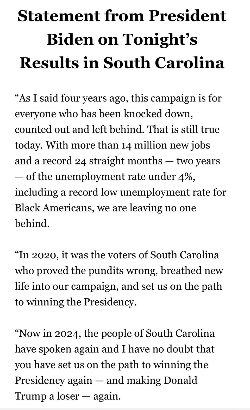 Dark Brandon spoke up in South Carolina last night, “Now in 2024, the people of South Carolina have spoken again and I have no doubt that you have set us on the path to winning the Presidency again — and making Donald Trump a loser — again.”