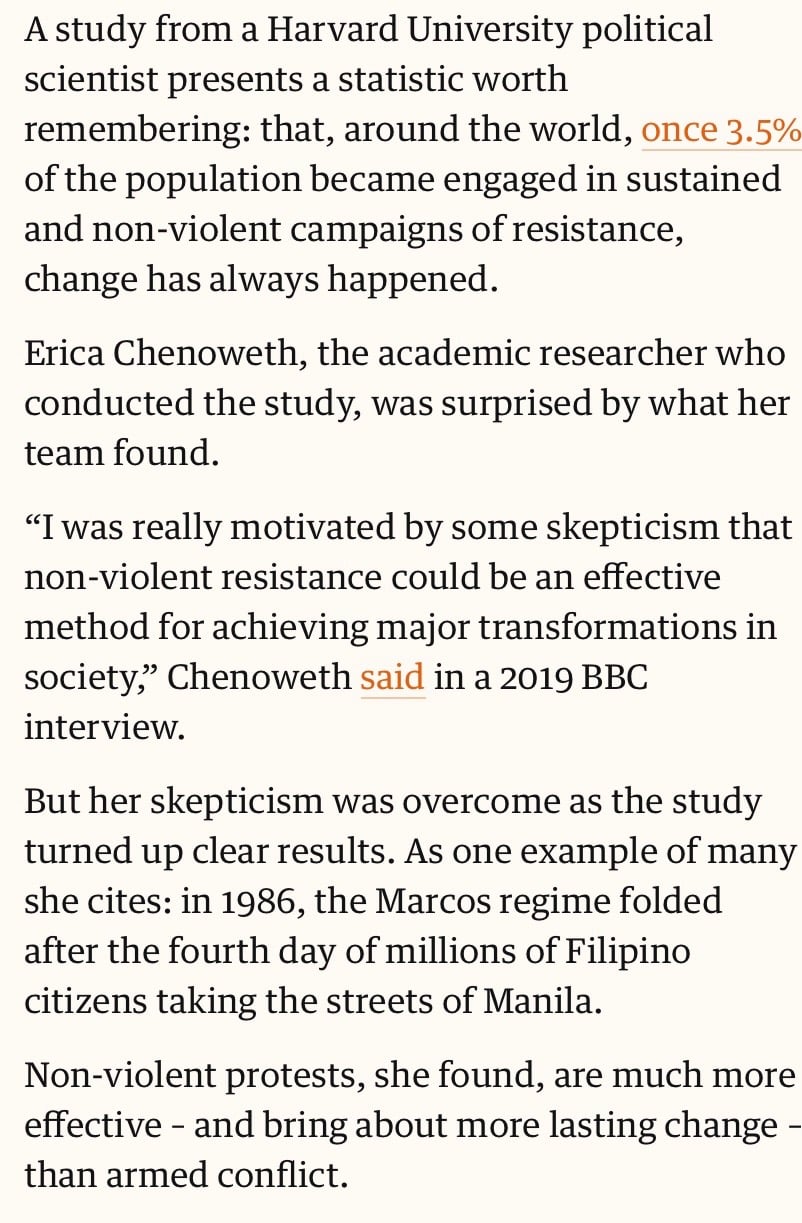 Regarding the “3.5% rule”, she points out that while 3.5% is a small minority, such a level of active participation probably means many more people tacitly agree with the cause.