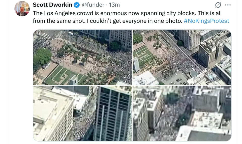 The New York Times reports about the protests worldwide - “Protests spread far beyond U.S. cities on Saturday. Videos and images posted to social media showed demonstrators gathering in Spain, England, Sweden, Germany and France, where they sang songs including “The Star-Spangled Banner,” wore patriotic clothing and carried signs. Eunic Epstein-Ortiz, the national spokeswoman for the “No Kings” group, which organized the protests, said there were close to 40 demonstrations across Europe, Africa, Asia and North America. Turnout has been “more overwhelming” than anticipated, Ms. Epstein-Ortiz said.”