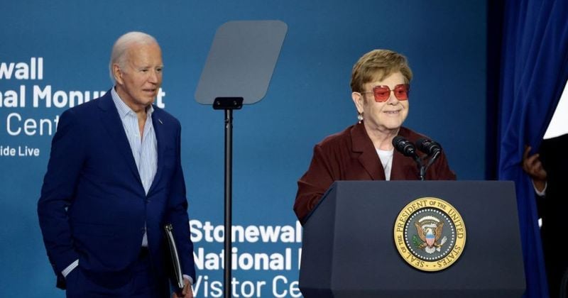 The President with Elton John at Stonewall Inn on Friday, celebrating the opening of the newly refurbished National Monument Visitor Center on the anniversary of the historic uprising.