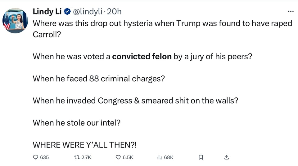 Trump allegedly stole classified information and tried to overturn an election. His plans for a second term are worse than the last one. We cannot be serious about letting such a crooked clown back in the White House.