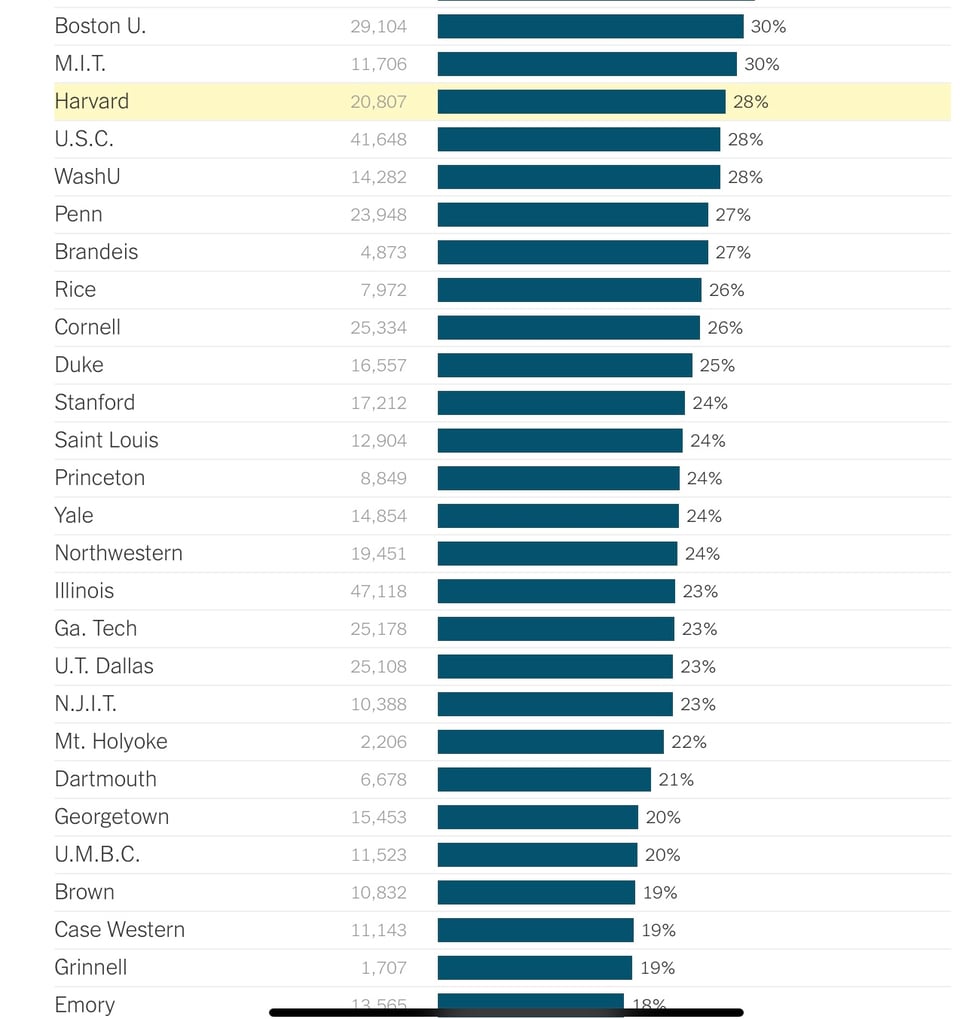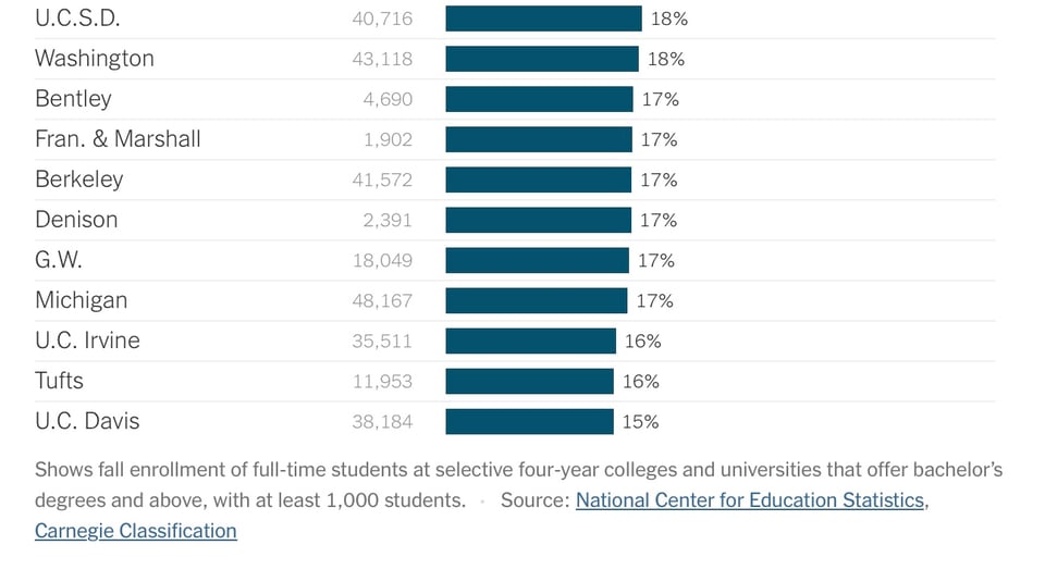 While international students make up slightly more than 5 percent of university students nationwide, some of the nation’s most selective schools rely far more heavily on them. At New York University, home to nearly 60,000 students, one-third of them are international. At Columbia, about two in five students come from abroad. And at Harvard, more than a quarter of students come from across the globe.