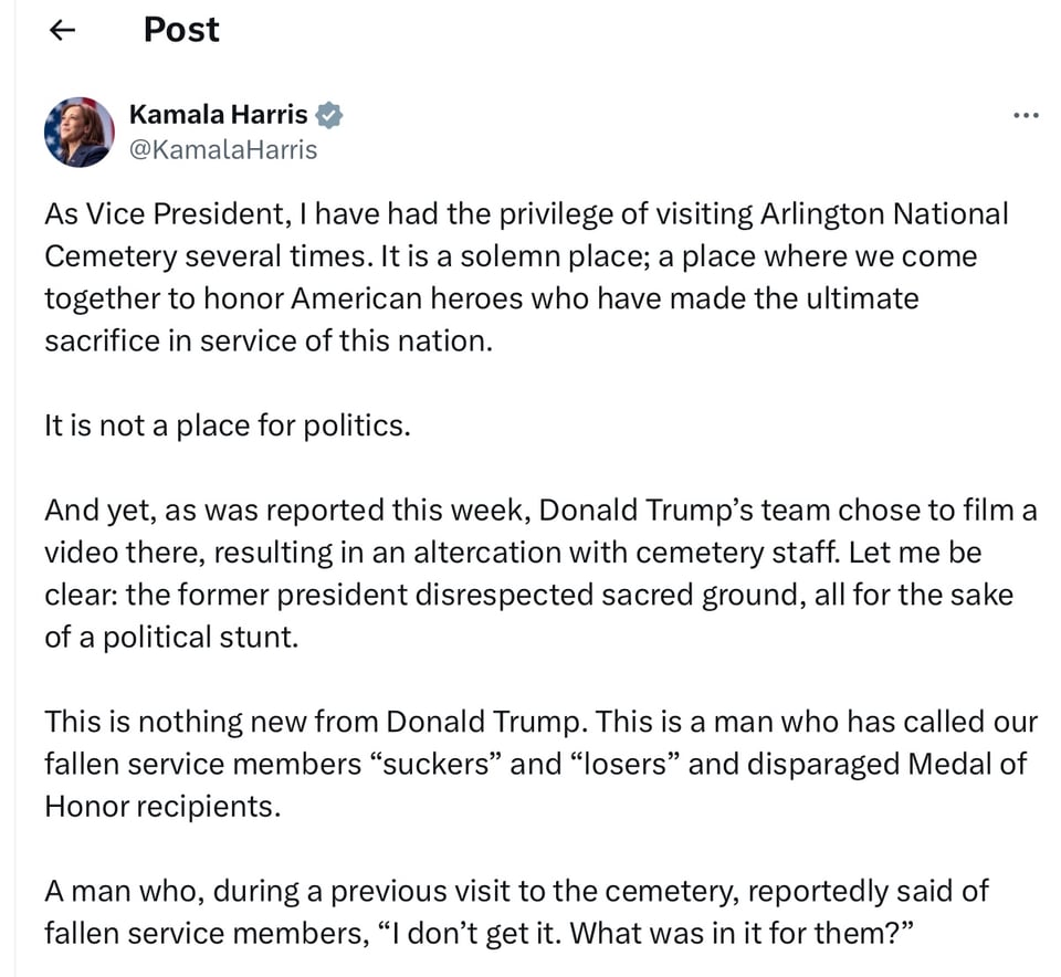 In her first public comments on the situation, Ms. Harris said that Mr. Trump had desecrated a solemn place that should be free of politics when he appeared there for a wreath-laying ceremony for 13 service members who were killed in a suicide bombing in Afghanistan during the withdrawal of U.S. troops three years ago.