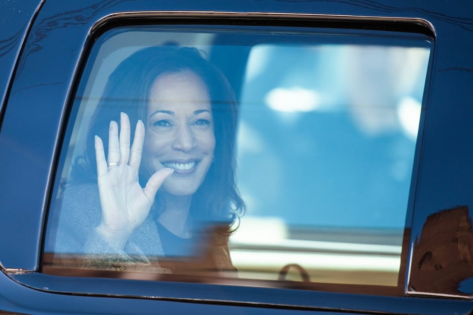 Vice President Kamala Harris waves to supporters on Penn Avenue in the Strip District of Pittsburgh after a brief campaign stop today.