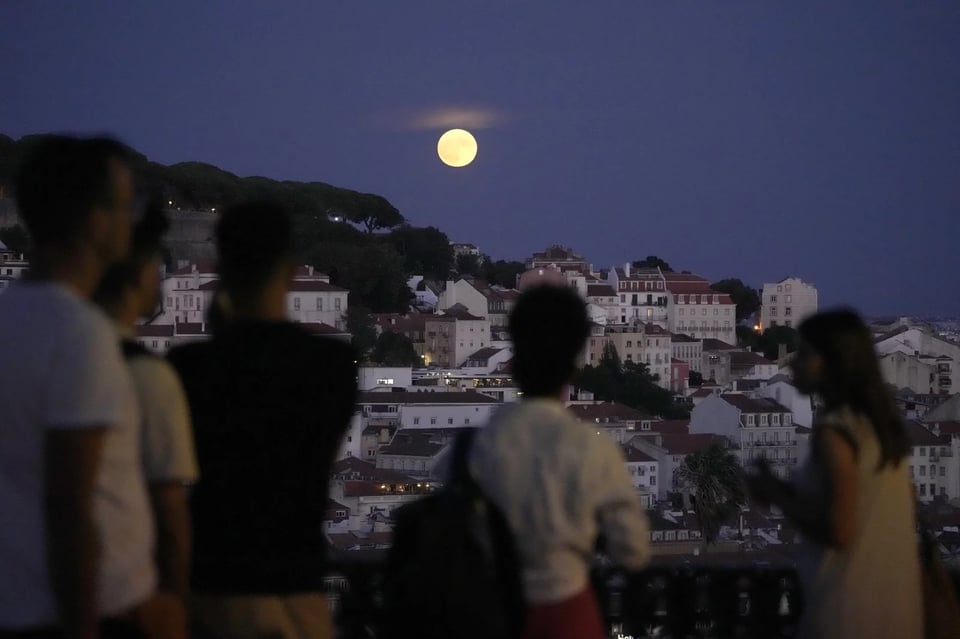 People watch a supermoon rise above Lisbon, Portugal on August 30.