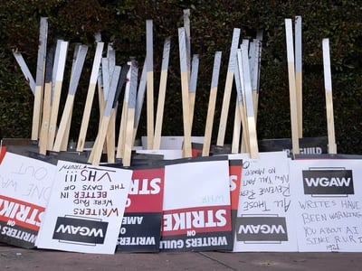 Placards are gathered together at the close of a picket by members of The Writers Guild of America outside Walt Disney Studios, Tuesday, May 2, 2023, in Burbank, Calif.