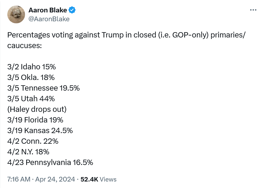 Pennsylvania’s primary election . . . revealed Trump’s real electoral weakness. He won about 83.5% of the Republican votes, but Nikki Haley, who dropped out of the race in early March and has not campaigned since, won 16.5%. In the suburbs of Philadelphia, . . .Haley won closer to 25% of the Republican vote. (Source. Heather Cox Richardson, Letters from an American).