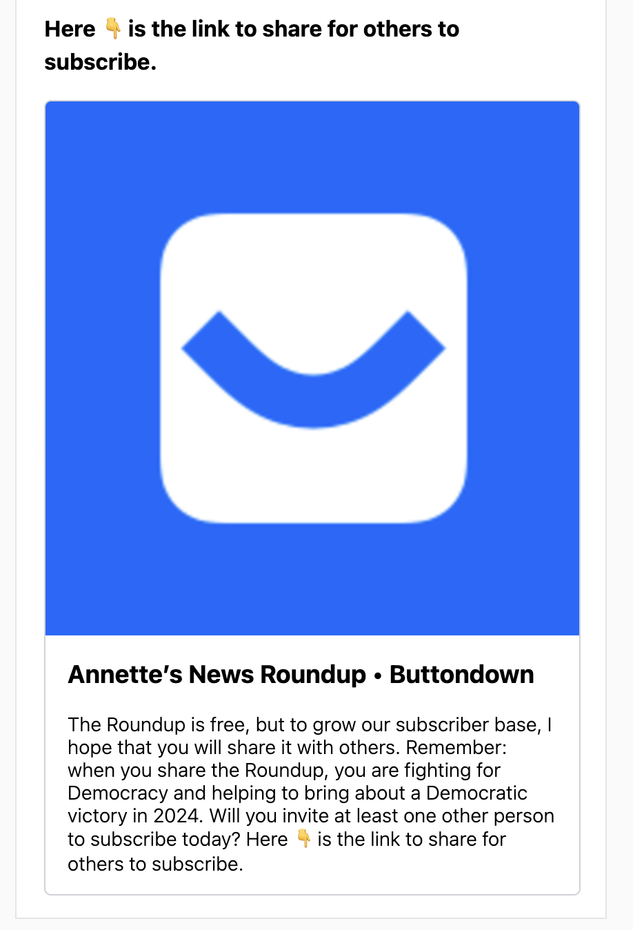 Tomorrow, the Roundup will once again resume a more familiar form. Please free too to share the Roundup and suggest friends subscribe. Annette