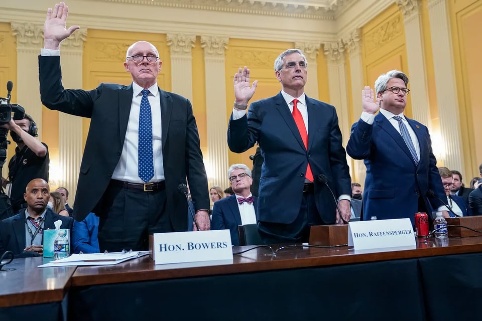 Arizona House Speaker Rusty Bowers, left, Georgia Secretary of State Brad Raffensperger, center, and Georgia Secretary of State Chief Operating Officer Gabriel Sterling are sworn in as the House Jan. 6 select committee holds its fourth public hearing on Capitol Hill on Tuesday, June 21, 2022.