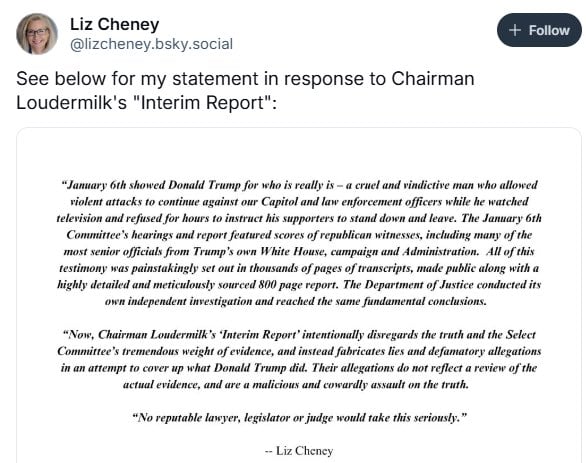 Ms. Cheney has denounced the report, saying it “intentionally disregards the truth” about her own committee’s work and “instead fabricates lies and defamatory allegations in an attempt to cover up what Donald Trump did.”