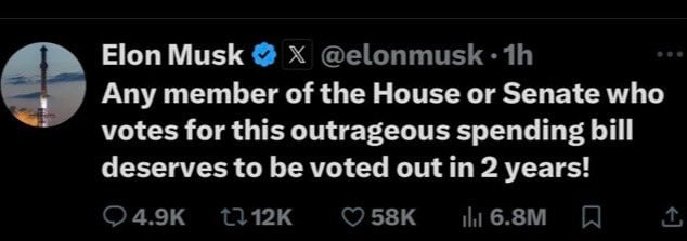 “Any member of the House or Senate who votes for this outrageous spending bill deserves to be voted out in 2 years!” Mr. Musk wrote in one post.