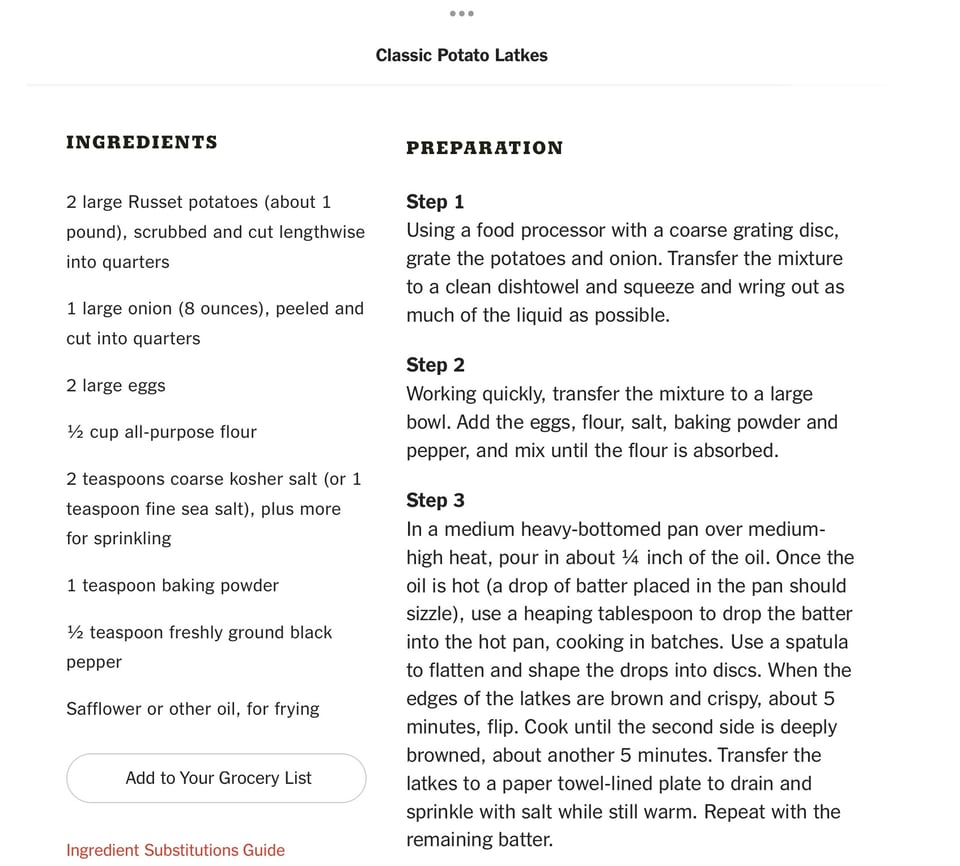 Classic Potato Latkes by Melissa Clark from NYT Cooking.