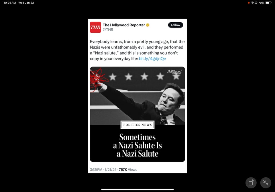 @ Jon Cooper wrote - If you want further proof that American journalism is dead, the Hollywood Reporter showed more moral clarity in their coverage of Elon Musk’s Nazi salute than the Washington Post, NY Times, LA Times, WSJ, CNN, MSNBC, ABC, CBS or NBC. Cowards all.