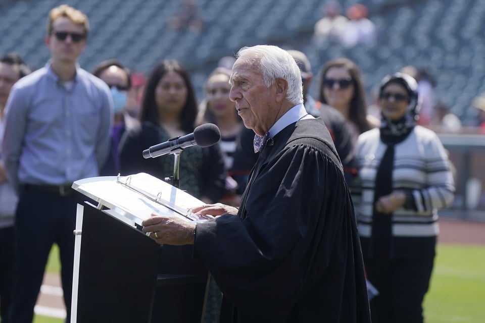 U.S. District Judge Charles Breyer speaks while naturalizing a group of people as U.S. citizens before a game at Oracle Park on Aug. 30, 2023, in San Francisco. | Jeff Chiu/.