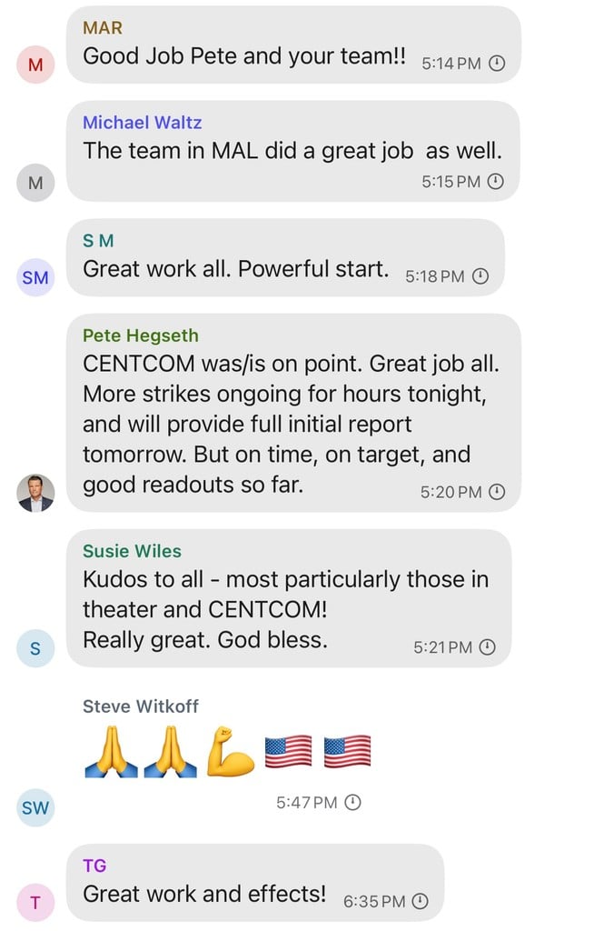 Later that afternoon, Hegseth posted: “CENTCOM was/is on point.” Notably, he then told the group that attacks would be continuing. “Great job all. More strikes ongoing for hours tonight, and will provide full initial report tomorrow. But on time, on target, and good readouts so far.”