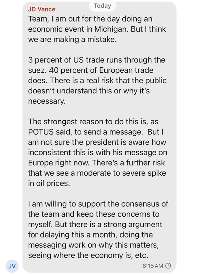 Shortly after, Vice President J. D. Vance texted the group, “I will say a prayer for victory.”