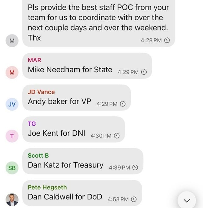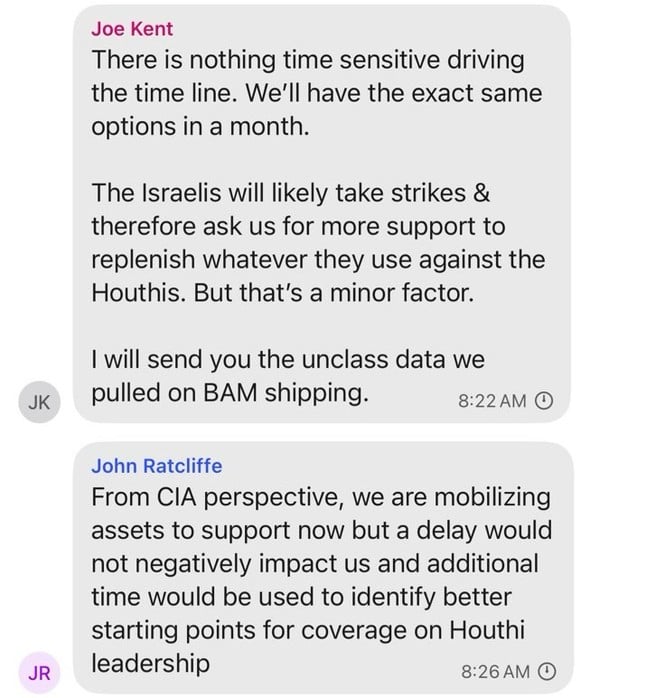 A CIA spokesperson asked us to withhold the name of John Ratcliffe’s chief of staff, which Ratcliffe had shared in the Signal chain, because CIA intelligence officers are traditionally not publicly identified. Ratcliffe had testified earlier yesterday that the officer is not undercover and said it was “completely appropriate” to share their name in the Signal conversation. We will continue to withhold the name of the officer. Otherwise, the messages are unredacted.