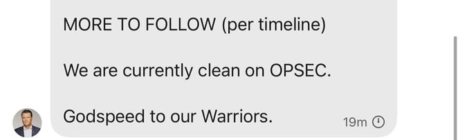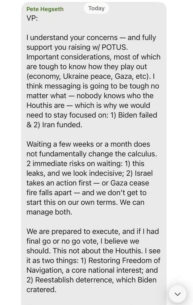 The text beneath this began, “TIME NOW (1144et): Weather is FAVORABLE. Just CONFIRMED w/CENTCOM we are a GO for mission launch.” Centcom, or Central Command, is the military’s combatant command for the Middle East. The Hegseth text continues: