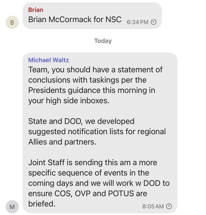 A CIA spokesperson asked us to withhold the name of John Ratcliffe’s chief of staff, which Ratcliffe had shared in the Signal chain, because CIA intelligence officers are traditionally not publicly identified. Ratcliffe had testified earlier yesterday that the officer is not undercover and said it was “completely appropriate” to share their name in the Signal conversation. We will continue to withhold the name of the officer. Otherwise, the messages are unredacted.