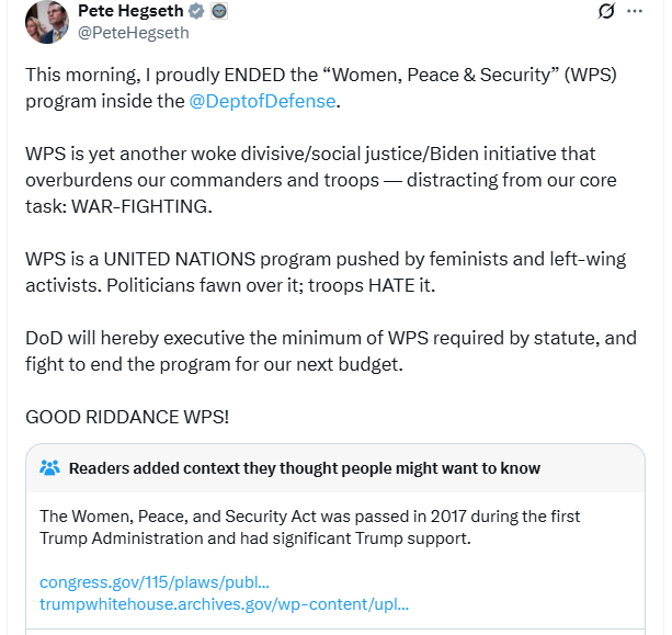 Hegseth’s CYA? In a follow-up tweet, he insisted that: “The woke & weak Biden Administration distorted & weaponized the straight-forward & security-focused WPS initiative launched in 2017. So—yes—we are ending the “woke divisive/social justice/Biden (WPS) initiative.” Biden ruined EVERYTHING, including “Women, Peace & Security.”