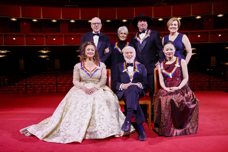 Former Kennedy Center board chair David Rubenstein, top left, and former president Deborah Rutter, top right, pose during the 43rd Annual Kennedy Center Honors on May 21, 2021 with honorees Joan Baez, Garth Brooks, Debbie Allen, Dick Van Dyke, Midori Gotō.