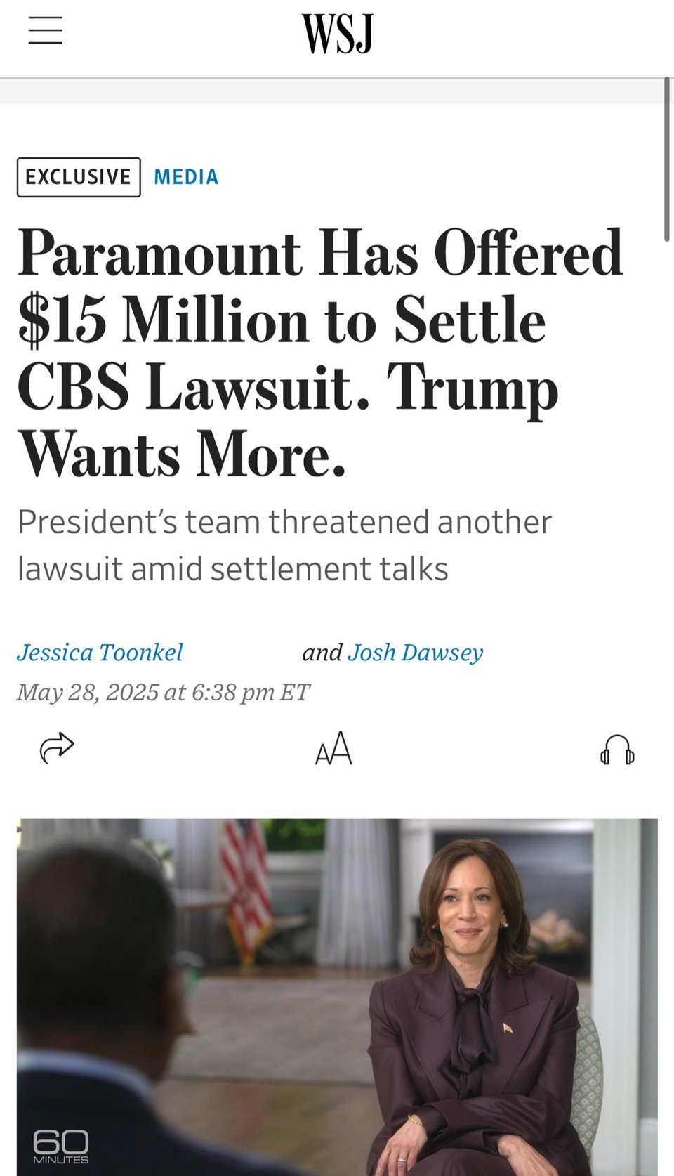 The lawsuit stemmed from CBS’ “60 Minutes” interview with Kamala Harris last fall, which the president claims was deceitfully edited. Trump is asking for $25 million to settle and an apology from the news network, WSJ reports.