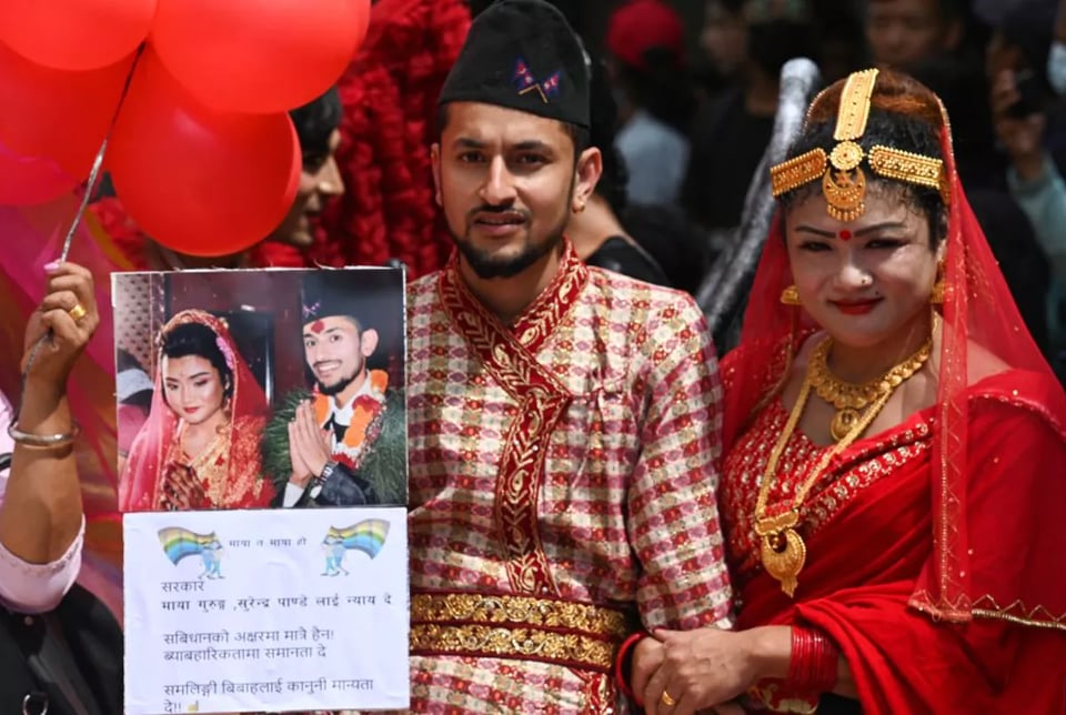 Maya Gurung, a transgender woman, and Surendra Pandey, a gay man, were wed in 1997 in a traditional Hindu ceremony but were unable to have their marriage recognized by the government. Under Nepalese law, transgender women are unable to change their gender.
